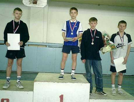 На высшей ступени пьедестала - рубцовский бадминтонист В. Овсянников, ставший абсолютным победителем первенства Российской Федерации (т.е. занявший первые места среди юношей (на фото), среди пар юношей и среди смешанных пар. На третьей ступени пьедестала почёта стоит второй рубцовчанин - М.Исаев, занявший третье место среди юношей и первое место (вместе с В.Овсянниковым) среди пар юношей. Тренируют спортсменов В. Осадчий и Н. Зайцев.