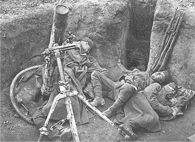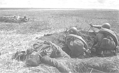 Пулеметные расчеты отсекают от танков пехоту противника, не допуская прорыва ее в наши окопы переднего края.