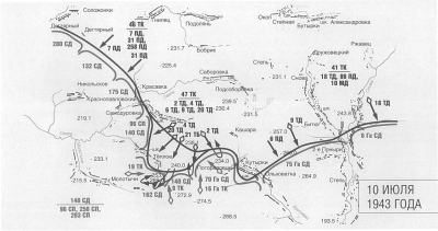 ДЕВЯТОЕ ИЮЛЯ 1943 ГОДВесь день 9-го июля 1943 года прошел в борьбе за станционный поселок Поныри. Бои продолжались днем и но-чью беспрерывно. На рассвете у Теплого нашими танками были атакованы немцы и выбиты из своих позиций. Отойдя на линию Самодуровка - высота 238.1, закрепились. Остальной день прошел в интенсивной перестрелке. Видно было то, что немцы готовятся к наступлению 10 июля 1943 года.