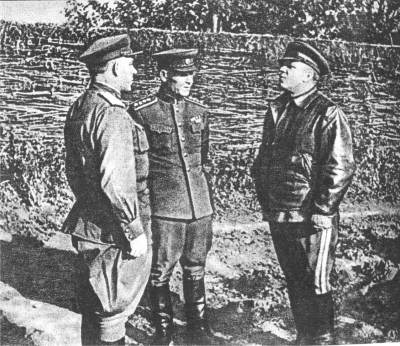 генерал-лейтенант И.М. Манагаров докладывает представителю ставки Маршалу Советского Союза Г.К. Жукову и командующему Степным фронтом
