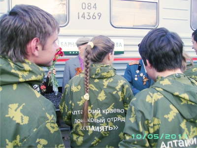 Возвращались домой мы на поезде Москва – Барнаул. Перед посадкой в поезд, на Казанском вокзале, состоялось, я бы сказал, очень важное знакомство с группой ребят из Алтайского краевого поискового отряда «Память». Они возвращались из очередного поиска по местам боев в Новгородской области. Я с удовольствием и большой благодарностью к ребятам слушал их рассказ о находках в местах захоронений и боев. Это были и солдатские медальоны с вложенными в них адресами, простые гильзы, оружие, солдатские каски, принадлежности туалета и так далее. По рассказам ребят, по удовлетворенности на их лицах я видел и чувствовал, какую огромную работу они проводят по восстановлению памяти о наших солдатах, которые не вернулись в кров родной. Приносят память о погибших родным и близким. При встрече и в беседах, а мы ехали до Барнаула в одном вагоне, я прямо им сказал: «Вы, мои юные друзья, делаете великое дело, своим трудом вносите главу в историю Великой Отечественной войны. Вы приближаете окончание войны, так как не похоронен еще последний солдат, а без этого война не считается законченной. И очень важно то, что вы в своих руках прочно держите стержень истории, связь времен и поколений, не давая ему прерваться, что крайне важно для нашего государства Российского». Да, надо сказать о том, что у ребят работа не простая. В ней нет комфорта, да и работа с землей требует определенных усилий. При расставании я по-солдатски им сказал: «Вы ребята, МОЛОДЦЫ, из одних заглавных букв. Усилием и трудом Таких ребят-энтузиастов возрождается и создается история нашего государства, могучего, имеющего богатую науку, культуру, свои богатые традиции и неповторимый облик.